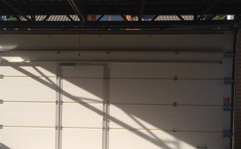 1. Секционные ворота состоят из полотна из стальных сэндвич панелей. Их толщина 40 мм, они имеют боковые накладки, окрашенные в бело-серый цвет близкий RAL 9002 на их торцах.